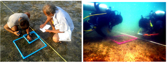 In relation to the ecological accounts, this study has followed the SeagrassNet protocol by Short et al.,18,19 consisting of three fixed, parallel, 50 m cross-transects referred to as cross-transects A, B and C, with cross-transect A closest to shore and C most seaward; B, midpoint of these cross-transects were established on a transect laid out seaward, perpendicular to the shore. Percentage cover of seagrasses was visually estimated within 12 randomly placed0.25m2 quadrats along each cross-transect using a photo guide of percent cover. As noted above these works were done intetidally in the coastal areas of the Myeik Archipelago (Figure 4A) but subtidally in the Rakhine coastal areas using snorkling or scuba equipment (Figure 4B). Positions and areas of seagrasss for each study site were recorded by GPS with extent being recorded by walking around the seagrass bed taking GPS points every 10 secs. The physical parameters, namely temperature using a mercurial thermometer, salinity using a refectometer, water depths using handheld sounder were measured in the field. The types of substrate were also recorded.
