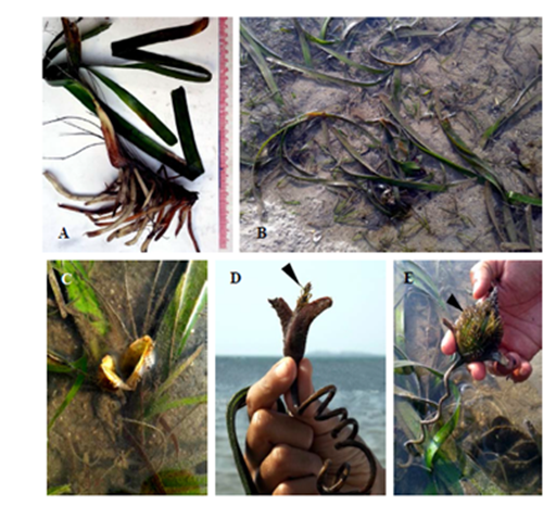 Figure 11 Enhalus acoroides: A. Habit, B. The natural bed, C. Male flower (arrowhead), D. Female flower(arrowhead) and E. Fruit (arrowhead).
