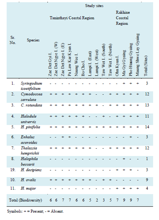 Keywords: Biodiversity, Conservation, Ecological accounts, Morphology, Local distribution, Myanmar, Percent cover, Rakhine Coastal Region, Taninthayi Coastal Region, Seagrasses taxonomy