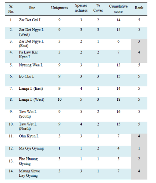Management actions are therefore required immediately to ensure these habitats are not lost which would have deveastaing consequences for both the aquatic environement and for people’s livelihoods. However given the limited resources available in Myanmar to manage all these areas focus must be steered towards those sites which could be considered key biodiverse areas. Therefore, to prioritise the most important sites and focus management inteverntions a simple ranking system was developed for the surveyd areas using uniqueness (in terms of species representation), species richness and percentage seagrass cover (Tables 1-4). Although all sites should receive some level of protection six sites stood out in terms of the above paramters with Ma Gyi Gyaing (39.83 ac) in Rakhine consider the most important site being 1) one of the most diverse, 2) the only site to conatin Halophila beccarii, the most threatened of all the 12 species recorded with a ranking of Vulnerable under the IUCN Redlist, and 3) because of its high percentage cover. Moreover, in terms of species diversity of seagrasses, Ma Gyi and Pho Htaung Gyaings showed the highest in the Rakhine Coastal Region with 9 species while Zar Det Ngye (East) I. and Pa Law Kar Kyan I, represented higest in the Myeik Archipelago waters including 7 species of seagrasses (Tables 1). Highest percentage cover of seagrass meadows was observed at Maung Shwe Lay Gyaing, in Rakhine Coastal Region with 67.36% whereas the lowest was at Lampi I. (West) with 18.75% (Tables 2), (Figures 17-18). Other sites worthy of immediate protection include Pho Htaung Gyaing (94.22 ac), Zar Det Ngye I. (East)(19.90 ac), Pa Law Kar Kyan I. (St. Luke I.)(83.00 ac), Ohn Kyun I. (17.30 ac) and Maung Shwe Lay Gyaing (23.79 ac) (Tables 3). As a first step, these sites should be provided some level of protection either as strict no-take MPAs or has carefully managed gear restricted areas with a strong emphasis on bottoms trawlers and other gears with may negatively impact the seagrass.