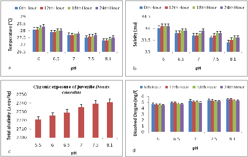 Figure 1 (a) Mean changes in the temperature of the microcosm chambers with respect to pH (b) Mean changes in the salinity of the microcosm chambers with respect to pH (c) Mean changes in the TA of the microcosm chambers with respect to pH (d) Mean changes in the DO levels of the microcosm chambers with respect to pH