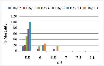 Significant rate of mortality was observed in pH 5.5, 6.0 and 6.5 after 15 days of exposure where as no mortality was observed in pH 7.0, 7.5 and control. The effect of Hypercapnia on the percentage mortality of the exposed animals is summarized in Figure 2. Apart from the sub lethal effects of induced hypercapnia, the survival rate of the exposed animals also depends upon the microcosm environment. The physicochemical parameters of the microcosm chambers varied significantly (p<0.05) with varying pH regimes thereby indicating an inter relationship between pCO2 and seawater variables.