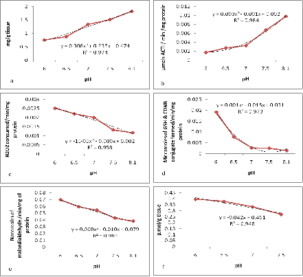 Glutathione - s - transferase activity: The GST enzyme activity increased with decreasing pH. Control exhibited an activity of 0.0025 µmol min-1 mg-1 of total protein when compared to pH 6 which expressed an activity of 0.0264 µmol min-1 mg-1 of total protein (Figure 3d).