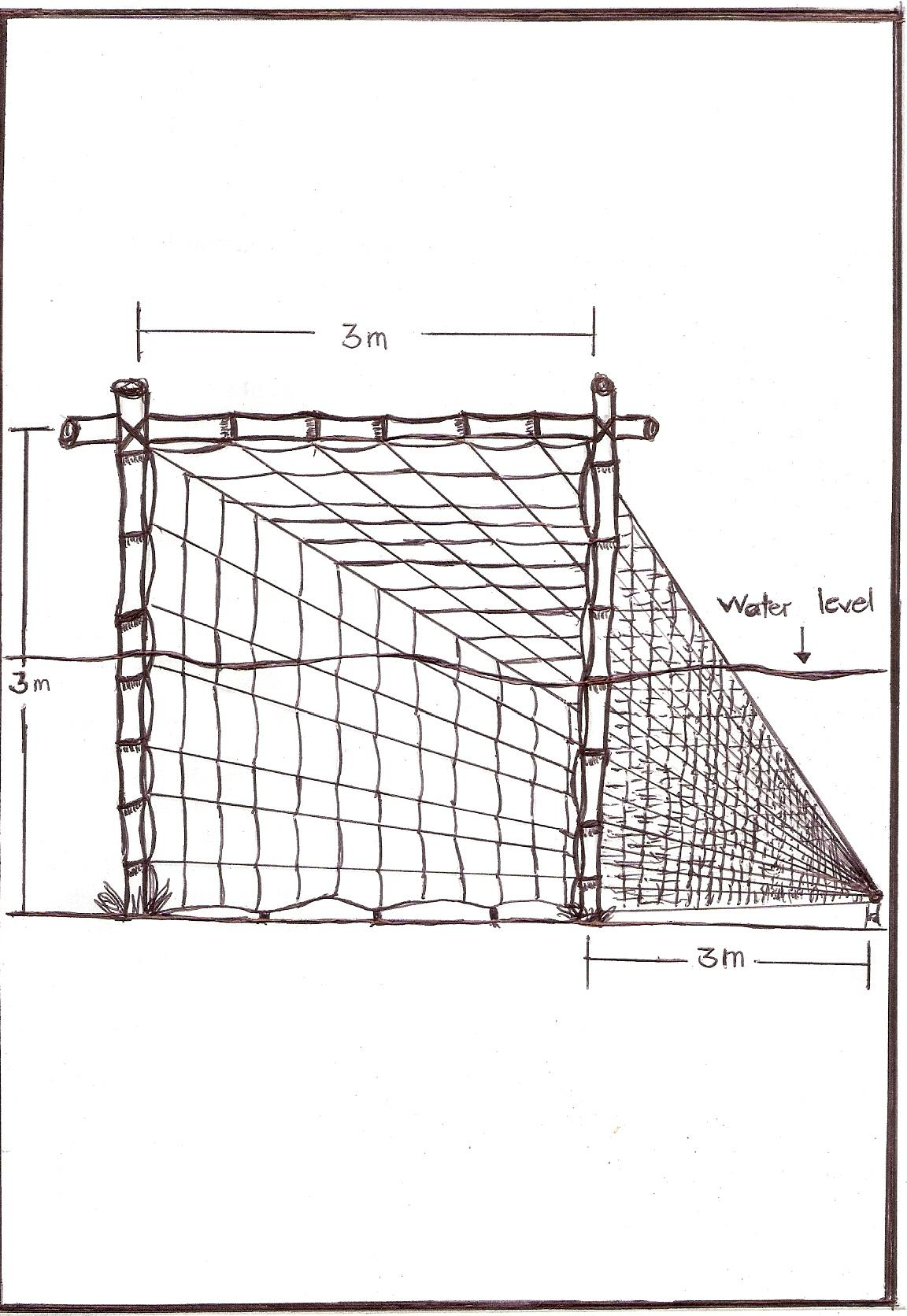 Two traps (Figure 3) were installed in every station.26 The trap was 3m x 3 m in length and width. The net stretched up to 3 m with a mesh size of 1.2 cm. It was made up of bamboo poles and plastic nylon net. The trap was installed in the Sargassum bed by digging two - three meter distant holes to erect the bamboo poles. The net was tied in both poles and the tail part of the net was anchored for stretching.