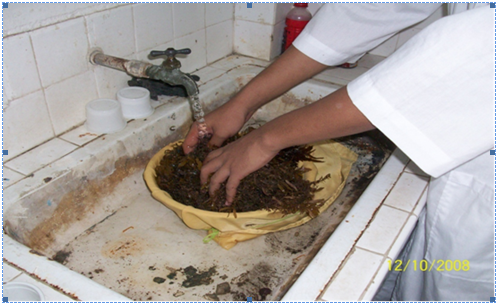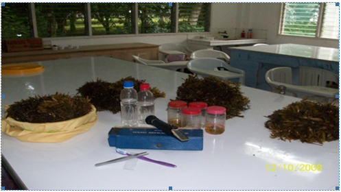 Biota determination: At MSU Naawan laboratory, the collected samples (Figure 4) were washed inside a sieve with mesh size of 20 µm (Figure 5). The removal of the phytal animals was done by using the brushing technique27 (Figure 6). Phytal animals that were not removed from the thalli were scraped by using a glass slide (Figure 7)28 or by using forceps (Figure 8 & 9).14 All collected organisms per 1 kg of Sargassum were placed in the pre-labelled bottle with 5% buffered formalin. Photomicrographs of the removed phytal animals were taken by using a Kodak digital camera. The biota per 1 kg of Sargassum was observed with the aid of a Swift light microscope and the species were counted and categorized according to major groups. The Sargassum spp were dried and weighed to constant weight for biomass determination which was expressed in DW biomass15
