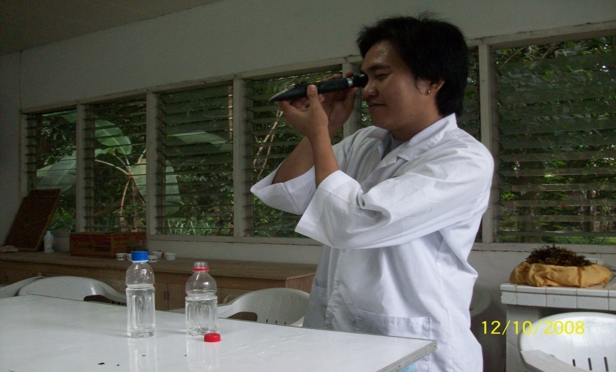 Aside from the WW and DW determination of Sargassum thalli other parameters determined were tides, depth, temperature and salinity. Tide cycle was obtained from a calendar which was used as the basis for the stretching of the trap. Water samples were collected for salinity analysis by using the ATAGO refract meter (Figure 10). Temperature readings were obtained by using a mercury filled thermometer. The depth was obtained by using a calibrated post of each trap.