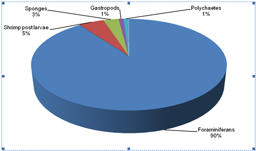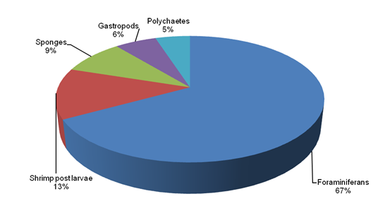 The foraminifera’s were the most abundant in both areas. Shrimp post larvae 13%, sponges 9%, gastropods 6% and polychaetes 5% were of high percentages in Lugait in comparison to Naawan which had relative abundance values of 5% for shrimp post larvae, 3% for sponges, 1% for gastropods and 1% for polychaetes. However, foraminifera’s with 67% in Lugait was lower in relative abundance in comparison to that of Naawan which was 90%.