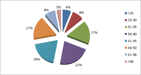 Age structure of fishermen: The data analysis indicates that the average age of fishermen is 39 years, ranging between 25 and 60 years. The age structure shows that 31% of fishermen are under 35 years old and 11% of them are over 50 years old. The most represented age group is 35 to 45. There are no fishermen under 20 years old (Figure 2).