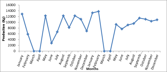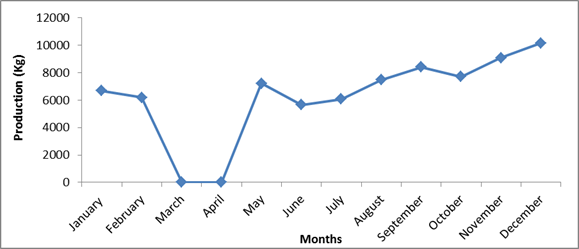 The monthly fish production variability in Sidi Saad reservoir indicates that the largest catches are made in autumn and winter (Figure 6). The monthly peak of production is recorded in December while the production is zero between March and April. This period corresponds to the prohibition of fishing activity in the Tunisian reservoirs. We also noted a drop in production during the summer with a minimum in June.