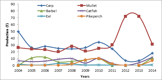 Figure 7 Production by species in Sidi Saad Reservoir between 2004 and 2014.14