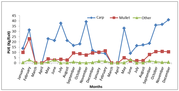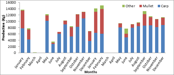 Carp production during the two years is dominant with a maximum recorded during the months of November and May. The minimum production of this species is observed during the month of June. Mullet production is highest in January-February and low in summer (Figure 9).