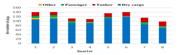 The time period of this investigation was 24 months of the triennium (2016-2017-2018), when checking the AIS data, with the aid of the website Marine Traffic, The amount of ship traffic was obtained. The graphic bar graph (02) which demonstrates the statistical results of the number and types of ships. A total of 3,919 vessels were checked during the survey period (Figure 1).