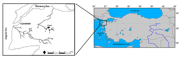 The study was completed on Kocabaş Stream in the Biga Peninsula in northwestern Turkey (Figure 1). The sampling stations were selected from upstream (upper station) and the downstream (down station) of the trout farm that established next to the Kocabaş Stream. As a control station, a control zone was selected from situated on the branch of the stream without fish farm (Figure 2). Between August 2015 and July 2016, fish samples were collected by electro shocking for each region (excluding January) in the designated areas. The collected fish samples were first brought to the laboratory in cold chain and identified according to the "Turkey Freshwater Fish".23