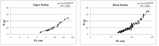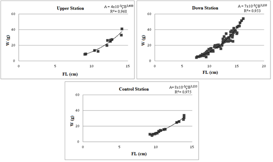 Populations belong to B. oligolepis and S. cii were caught on Kocabaş Stream. Populations belong to both species were found in the upper and down stations, whereas only S. cii was found in the control station. When B. oligolepis samples captured from Kocabaş Stream were evaluated, b values were found to be 3.17 in the upper station and 3.31 in the down station (Figure 3). In the samples evaluated by Pauly t test, the value of b at the lower station is statistically different from 3 (P<0.05). It can be said that B. oligolepis individuals caught from the Kocabaş Stream exhibited an isometric growth in the upper station and a positive allometric growth in the down station.