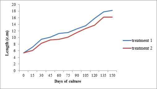 Growth, production and survival of shing (Heteropneustes fossilis) during study period are shown in Table 3.The mean stocking weight of shing was equal in T1 and T2 treatments which weighed about 12g. The mean harvesting weight of shing was 70.5±4.62g, 59.29±3.86g, in T1 and T2 treatments, respectively. The result showed that the mean weight gain of shing at the end of the experiment was 58.5g, 47.29g in T1 and T2 respectively which was significantly different (p<0.05) from each other. Mean length of shing at the end of this study was presented in Figure 1. It is observed from the experiment that, handmade feed is more preferable than industrial feed for the fish growth. The highest mean weight gain in T1 might be due to use of good quality protein source and fish might use it appropriately. The food conversion ratio (FCR) of shing fish species at different treatments was observed at 1.6±0.01 and 1.8±0.01 in T1 and T2 respectively which was differ significantly. The highest FCT was found in T2 (1.88) while the lowest was in T1 (1.6). 15