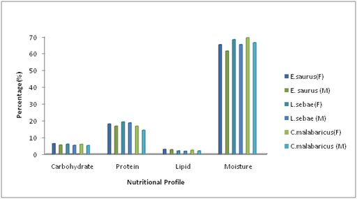 The essential amino acids are lysine, methionine, threonine, tryptophan, isoleucine, leucine, phenylalanine and valine. Failure to obtain enough of even one of the essential amino acids results in the degradation of the muscle proteins in the body. Recent evidence shows that some amino acids and their metabolites are important regulators of key metabolic pathways that are necessary for maintenance, growth, feed intake, nutrient utilization, immunity, behaviour, larval metamorphosis, reproduction, as well as resistance to environmental stressors and pathogenic organisms in various fishes. In recent years, fish lipids have also assumed great nutritional significance owing to their protective role against the development of cardiovascular disease and rheumatoid arthritis.10 Hence, consumption of fish, both freshwater and marine, is therefore being encouraged. Hence the present study shows the comparative analysis of biochemical composition of some marine fishes of landing site of Tuticorin and market of Madurai district.