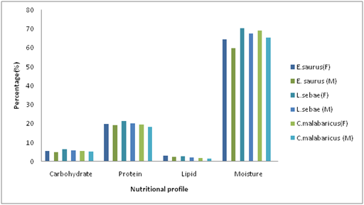 Fishery products are important not only from a nutritional point of view, but also as an item of international trade and foreign exchange corner for a number of countries in the world. Fish and shellfish are highly perishable, and prone to vast variations in quality due to differences in species, environmental habitats and feeding habits. The freshness of fish is affected by poor handling, transportation, and decorboxylation. In the present study biochemical parameters like moisture, protein, carbohydrate and Ash content from three types of edible marine fishes viz., Elops saurus, Lutjanus ebae and Carangoides malabaricus were estimated and represented in (Figure 1- 6). Moisture is one of the major components of all species and all types of fish. The percentage of moisture is good indicator of its relative contents of energy, proteins and lipid. The result specifies that the moisture content of fresh marine fishes were more than the market fishes, which ranged from 60.0 % to 76.5% The Carbohydrate content of fresh marine fishes, were ranged from 5.1 % to 7.6%, which is higher than the market fishes. Fishes are known to be a source of protein rich in essential amino acids (lysine, methionine, cystine, threonine and tryptophan).14 From the analysis of protein content, fresh marine fishes ranged from 15.5 % to 21.5% and it was higher than the market fishes. Protein and lipid are the major nutrients in fish and their levels help to define the nutritional status of the particular organism.15 Fish and shellfish are highly perishable, and prone to vast variations in quality due to differences in species, environmental habitats, feeding habits and action of autolysis enzymes as well as hydrolytic enzymes of microorganisms on the fish muscle.16 The lipid content of fishing site fishes ranged from 1.3 % to 3.2% and it was higher than the market fishes. Generally fish can be grouped into four categories according to their fat content lean fish, low fat (2 to 4 %), medium fat (4 to 8%), and high fat.17 The marine fishes (Lutjanusquin quelineatus and Scolopsis bimaculatus) had higher lipid content than other fishes; hence they were classified as high fat group. The observed range of ash content in the fishes indicated that the species is a good source of minerals such as calcium, potassium, and iron. Ash is a measure of the mineral content of food item. It is the inorganic residue that remains after the organic matter has been burnt off. A good source of instant energy that comes to the mind is carbohydrate. It also helps in the body’s development and growth.18 The Ash content of fresh marine fishes were ranged from 4.56 % to 2.01 %, this was higher than the market fish.Small indigenous finfish species had considerable range of ash content but the percentage of occurrence was low compared with crustaceans.19 However, the findings of this study show that’s the comparison between the average nutritional level of landing site fishes and market fishes. Fish quality is a complex concept involving a whole range of factors, which for the consumer include for example: safety, nutritional quality, availability, convenience and integrity, freshness, eating quality and the obvious physical attributes of the species, size and product type. Information about handling, processing and storage techniques, including time and temperature histories that can affect the freshness and quality of the products is very important for the partners in the chain.18 The quality of fish landings in the country is generally poor and wastage is high, especially in catches of multi-day boats. About 25–30 % of the fish catched and landed by these boats is of poor quality, as the fish holds of these boats are not refrigerated. These type of catching aim at quantity rather than quality, and sell the poorer quality or spoiled fish to dried fish processors at a low price. Lack of knowledge regarding improved fish handling and post-harvest practices has contributed to the poor quality of fish and fishery products.19