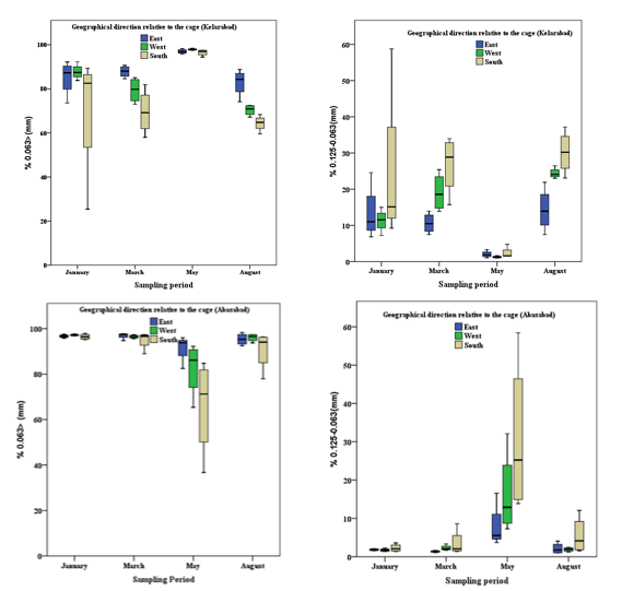 A review of past sources shows the high share of silt-clay grains in sediment granulation at depths with an average of more than 20 m in the southern Caspian Sea.25,31 Usually, annual changes in the percentage of sand have been reported in other studies in the southern basin of the Caspian Sea, which depends on the amount of sediment inflow into the Caspian Sea and the rate of sedimentation. In the present study, the percentage of very fine sand grains increased significantly in May in all stations. In this increase, a regular trend was observed, so that this increase was more in the south direction in the stations farther from the cage. Due to the long distance of the sampling areas from the coast and the low impact of river flows on the change of substrate sediment texture, the possibility of the impact of sea currents is possible. In this study, the total organic material of the substrate in both sites outside the rearing period had minimal values in August. However, the highest measured values were related to January and before the start of rearing and during the fish farming period. During the rearing period, the maximum values were related to March. Therefore, its changes cannot be considered exclusively because of fish farming. In some studies, it has been suggested that seasonal changes in the amount of organic material in the surface layer of sediments are integrated with the effects of fish farming.32