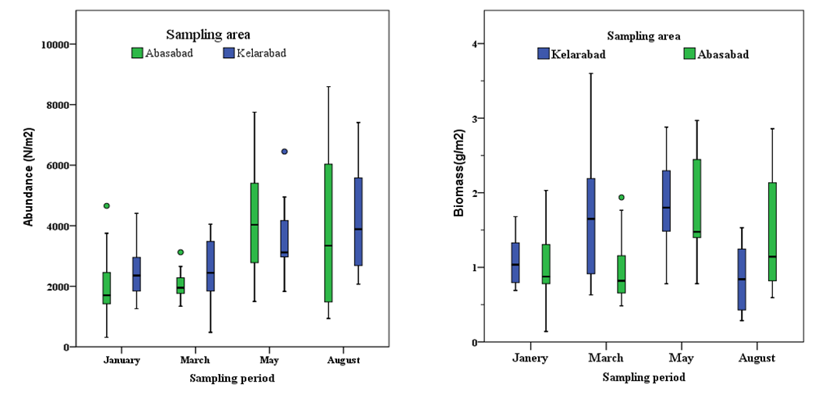 However, the difference in macrobenthos indices values was significant during sampling period in two marine farms. Also, in investigating the trend of change in each biological index were determined by highest computational values related to Simpson index in August and the lowest values of other indicators in August (P>0.05)(Table 6).
