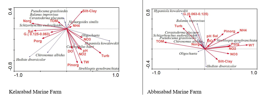The results showed that there was a focal correlation between biotic and non-biotic factors around cage culture in Klarabad and Abbasabad regions with a linear relationship under RDA testing (Figure 5).