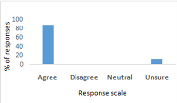 Question 5 had a slightly lower response rate of 87.5%, compared to the response rate of 100% of previous questions. The major response to the type of relevant knowledge was “Other”, with a response of 57.14%, while agriculture had 21.43% of responses, followed by fisheries, biology and chemistry on an even 7.14%. In response to whether they had any experience in practising agriculture, hydroponics, aquaculture or aquaponics, 87.5% answered negative, while interest in actually undertaking an aquaponics system was split 50/50.