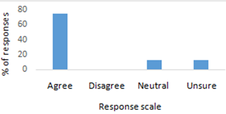 Regarding the area of knowledge of aquaponics about 63% of respondents heard the term ‘aquaponics’. Respondents had a generally positive attitude towards aquaponics with 87.5% agreeing that aquaponics is a safe and clean method of raising fish and growing vegetables simultaneously (Figure 1), and that it impacts the environment in a positive way (Figure 2). About 75% agreed that aquaponics grew products with a high nutritional value (Figure 3). In response to whether aquaponics is a humane method of raising fish, less than half agreed this was the case, with 43.75% of respondents agreeing with the statement, while the remainder were either neutral, or unsure. When it came to whether people would be interested in learning more about aquaponics, 50% indicated they would like to learn more, whereas 50% where neutral. Respondents had average to no knowledge of urban farming techniques, with the results relatively evenly split across the three lowest rated responses, and none recorded against anything above average.