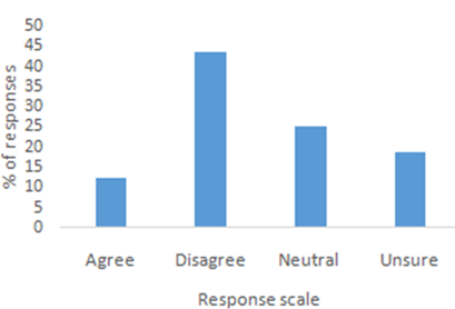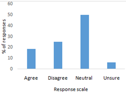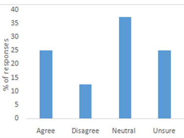 The final closed ended section of the survey centred on people’s attitude towards aquaponics. The first question asked whether the respondent would be inclined to buy aquaponically grown vegetables next time they are out shopping for produce (Figure 5). Just over half (56.25%) were either neutral or unsure about whether they would. About 25% responded negative, while 18.75% indicated that they would buy. On indicating a preference between aquaponically-farmed, and conventionally farmed fish, one fourth of the respondents indicated that they would prefer to buy the former.