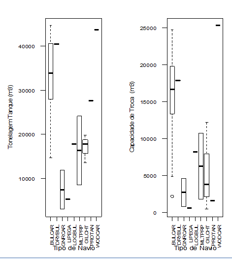 For this sample, the results for the "type" parameter ship indicate the most frequent type of cargo handling performed in the Amazon Basin. As the region is an exporter of goods, the predominant type of ship is the Bulk Carrier (Bulk), followed by tankers that supply the region with fuel. In Figure 4 is shown two-Box Wiskas type graphics that relate the type of ships with the storage capacity (tonnage) and ballast water exchange (m3), with the predominance of the vessels was the type Bulk Carrier (72,7%- BULCAR), Oil/Chemical Tanker (6,8% - OILCHT), Multi-purpuse Cargo (4,5% - MLTPRP), General Cargo (4,5% - GNRCAR), Cavaqueiro (Woodchip S Carrier) (2,3% - WODCAR), Dry Bulk Carrier (2,3% - DRYBUL), LPG(2,3% LIPEGA), Log Bulk Carrier (2,3% - LOGBUL), Product Tanker (2,3% - PROTAN). For comparison with the Port of Santana, the Port of Itajai, in 2003, 75% of these vessels consisted of containers ships class, followed by general cargo and refrigerated 8.2%.17