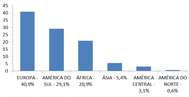 An analysis of Figure 5 allows us to observe the distribution of the frequency of vessels in twenty-one different countries, including Brazil as the largest ballast water supplier 115,119.18 m3 (19.5%), followed by Italy (16.5%) and Spain (9.3%). In addition, Figure 6 shows a graph of percentage of Ballast Water continent (there were no reports of ships from Oceania). According to Figure 6, distribution is observed in six different continents, with South America and Africa as larger ballast water suppliers with 50% added, followed by Europe with 40.9% for the Port of Santana, was a result of 50% for African countries, and 50% for Brazilian origin of ballast water, which makes this port at a high level of risk bioinvasion.(Table 5)
