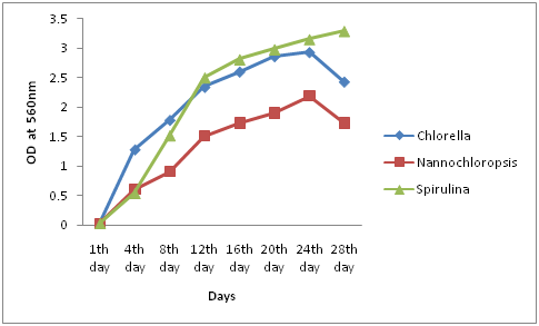 The growth rate found to be at range between OD at 1.28 and 2.93 in Chlorella vulgaris, maximum range between OD at 0.606 and 2.19 in Nannochloropsis bacillaris and thehighest growth rate was observed at the OD value of 3.29 during 28th day in Spirulina platensis.