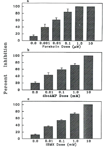 Elevation of intraoocyte cAMP by agents such as forskolin, dbcAMP and IBMX inhibited MIS- induced maturation of denuded goldfish oocytes (Figure 1). This inhibitory effect was dose- dependent. Complete inhibition of MIS-stimulated denuded goldfish oocytes was observed at 1 and 10 µM forskolin (Figure 1a), 10 mM dbcAMP (Figure 1b) and 10 mM IBMX (Figure 1c). Even at very low concentrations, 0.001 µM forskolin or 0.01 mM dbcAMP or IBMX, significantly decreased (P<0.05) maturation of MIS-stimulated denuded goldfish oocytes. Forskolin had about 1000x greater inhibitory effect than dbcAMP or IBMX. The half-maximal inhibitory dose of IBMX or dbcAMP was 0.1 mM as contrasted to 0.01 µM of forskolin.