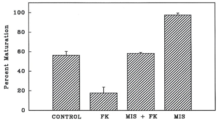 Figure 2 Percent maturation of denuded oocytes stimulated with MIS (17, 20 P) at 1 µg/ml only, MIS in the presence of forskolin (FK) at 0.01 µM, and in 0.01µM forskolin only. GVBD was scored after 24 h. Oocytes cultured without any stimulation served as control.