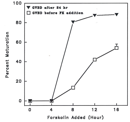 Figure 3 shows the effects of 10 µM forskolin (FK) added in separate cultures of MIS-stimulated denuded goldfish oocytes at 4 h intervals, and after which, incubated further for 24h.