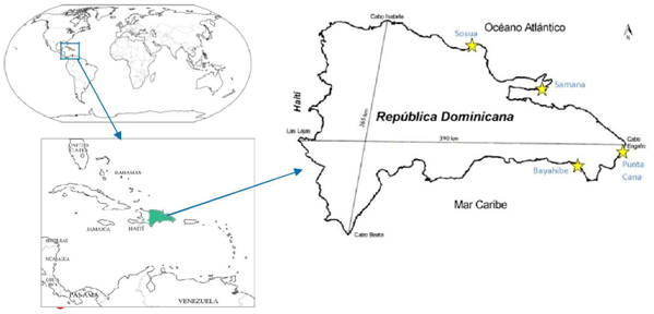 Figure 2 Dominican Republic map showing the selected study areas: Bayahibe, Punta Cana, Samana and Sosua).