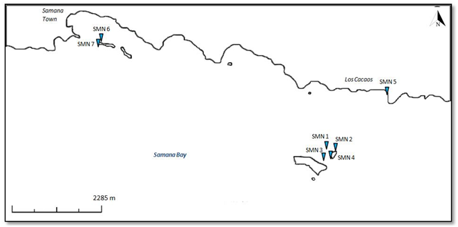 Samana: The study area in the Samana Bay included the town of Samana and “Los Cacaos”, located approximately 15 minutes East of the town of Samana. This region of the Dominican Republic is very humid. The Samana Bay is influenced by the discharge of several rivers, carrying an important amount of sediments creating a seabed composed of fine estuarine sediments of terrigenous origin, probably devoid of macro-vegetation. The Yuna river system discharges to the west in Samana bay and together with the “Los Haitises” and the “Sabana de la Mar” watersheds, they form the largest estuarine system of the Caribbean islands. The waters in the entire region are generally murky due to the high loads of sediments, limiting coral growth.15