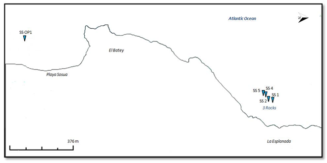 Sosua: The Sosua region, located at northern coast of Dominican Republic, extends from east to west along 72 miles of the Atlantic coastline integrating a complex geosystem mosaic of plains and wetlands, fluviomarine valleys and river heights with erosive and erosive-denudation low mountains. The sublittoral geomorphology presents a rocky conglomerate similar to a coralline barrier 200 m away from the coastline, protecting the beach development. The sublittoral geomorphology is mainly formed by sandy bottoms with or without sea-grass and macroalgae with shallow coralline rocky patches with sandy channels.16 At low tide the average water flow matches with the wind westbound, but at high tide an eastward strong current can occur. This implies that under certain meteorological and oceanographic circumstances, the region may receive the influence of the Sosua River.