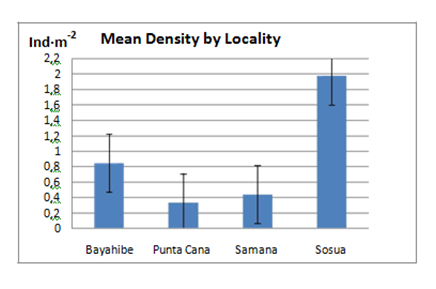The mean density of Diadema antillarum for the four communities surveyed was 0.89±0.11 Ind·m-2 (Mean ± SE, n=48), ranging from 0 to 11.67 Ind·m-2. The total mean density at each of the four surveyed localities was highest in Sosua (1.98 Ind·m-2), followed by Bayahibe with 0.82 Ind·m-2, Samana (0.44 Ind·m-2) and Punta Cana (0.30 Ind·m-2).