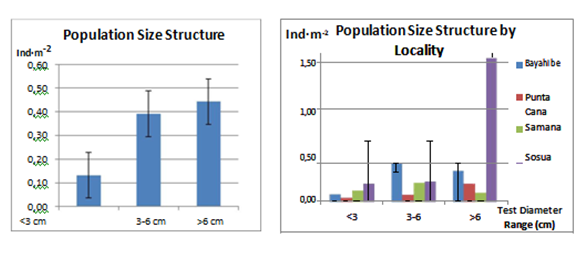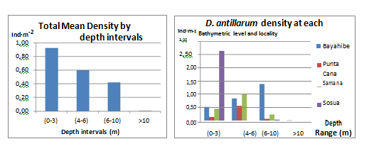 The results observed on the rest of localities do not show a clear pattern. Punta Cana shows a low abundance in general for the three size classes with highlighting peak (1.40 Ind·m-2) of Class 2 individuals at intermediate depths (4-6 m). Samana had a greater density of juveniles (2 Ind·m-2) at the intermediate depth interval (4-6 m) than all other sites. At Sosua the mean density of Diadema was found to be exceptionally high at shallow waters due to the concentration of this sea urchin at an island-rock that resulted on average values, for all size classes (1-3), much higher in the shallower depth interval (0-3 m): Class 1 (0.39 Ind·m-2), Class 2 (0.59 Ind·m-2) and Class 3 (1.58 Ind·m-2), Diadema was almost absent for the rest of transects.