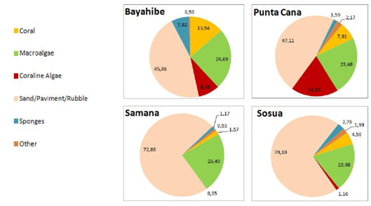 The northern regions (Samana and Sosua) presented higher percentage of sediments, 72.88% and 70.10% respectively; while Bayahibe and Punta Cana had 45.86% and 47.11%. The Sponge coverage found at Samana (1.17%), Sosua (2.78%) and Punta Cana (1.59%) was very low. Coralline algae cover was much lower at the northern localities; it was completely absent in Samana, while Sosua had a value of 1.16%. Greater values were observed at Bayahibe 8.4% and Punta Cana 18.65%. The mean benthic cover for the Dominican Republic, based on these four localities was: 6.75% Coral; 22.66% Algae; 7.06% Coralline Algae; 58.99% Sediments and 3.14% Sponges (Figure 12).