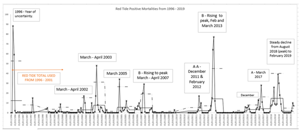 March was the peak month of mortalities in 2013 (Figure 3), with 138 deaths out of 277 deaths recorded (66% of the 2013 Red Tide Total). The month of February followed, with 80 deaths recorded (28.8% of the 2013 Red Tide Total). In 2018, there is a different system with no standout month, but in August 68 mortalities were recorded (23.6%), and 60 in May (20.8%), out of the 288 Red Tide mortalities that year. The extended tail-off in mortalities in 2018 is important, as it shows a significant change in the system from August 2018 to February 2019.