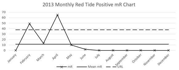 Monthly data reveals specific events, namely in February to March 2013, when the mortality rose dramatically above the natural limit and then fell to a steady state (on or near zero monthly Red Tide deaths) in May 2013 (Figure 1). This change in the system from ‘steady-state’ to ‘Red Tide’, back to ‘steady-state’ by May also appears in the mR chart (see Figure 3), thereby confirming the changes in the system.