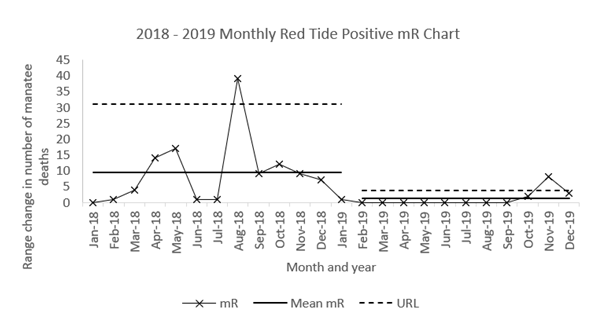 Figure 4 Moving range (mR) chart of monthly Red Tide Positive mortalities in Florida manatees (2018 -2019) including Mean mR and Upper Range Limit calculated using the formula: x̄+2.66(mR).