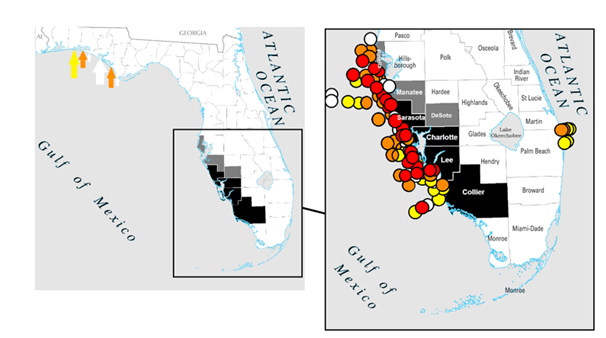 Figure 5 Florida, USA and (inset) the southwestern counties showing, in black, regular locations of Red Tide mortalities of manatees, and in dark grey occasional locations. Data points (right) indicate, the coastal locations in September 2019 identified with greater than normal background cell count (<1000 cells/litre) for K. brevis from Weisburg et al., (2019), where white=very low (>103 - 104 cells/litre), yellow= low (>104 - 105 cells/litre), orange=medium (>105 - 106 cells/litre). and red=high (>106 cells/litre). A small number of counts at these levels were on the northern gulf coast as indicated on the full state map (left) shown by arrows in the same colour scheme.