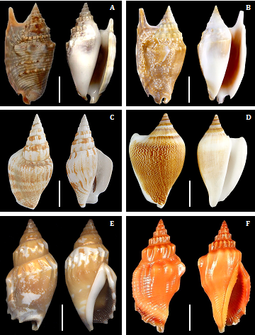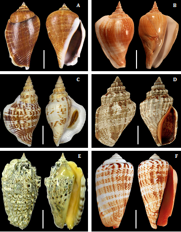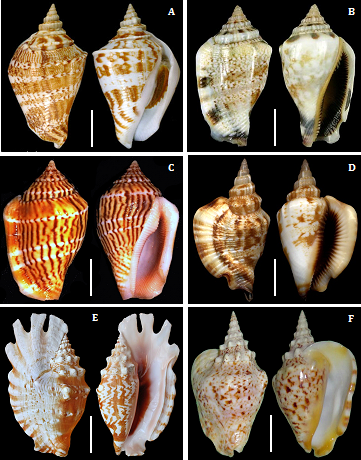 Figure 4 (A-F) Some marine conchs in Myanmar: (A) Strombus marginatus Linnaeus, 1758; (B) S. microurceum Kira, 1959; (C) S. mutabilis Swainson, 1821; (D) S. pulchellus Reeve, 1851; (E) S. sinuatus Humphrey, 1786; (F) S. thersites Röding, 1798. Scale bars=7 cm.