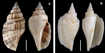 Figure 5 (A-B): Some marine conchs in Myanmar: (A) Strombus urceus Linnaeus, 1758; (B) S. variabilis Swainson, 1820. Scale bars=7 cm.