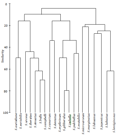 As with binary similarity coefficient analysis, binary occurrence or non-occurrence of each data set used to compare in the form of community similarity by using the Sorensen similarity index (Ss).14