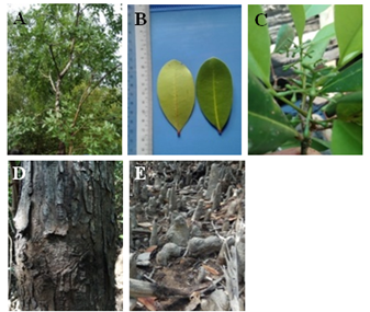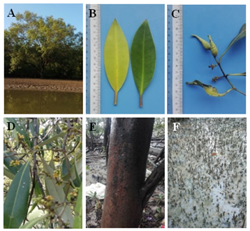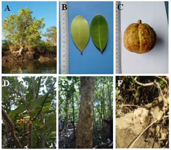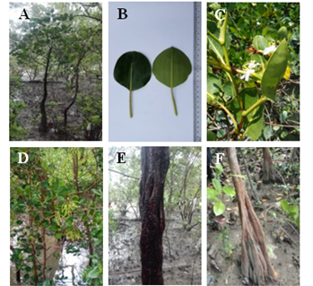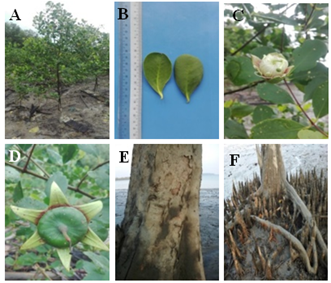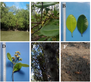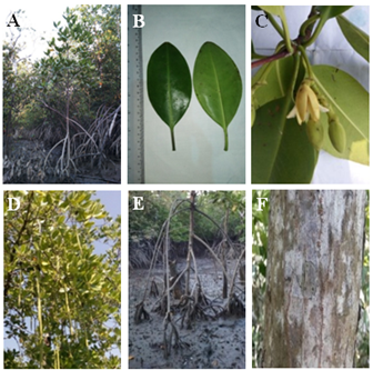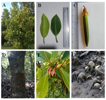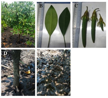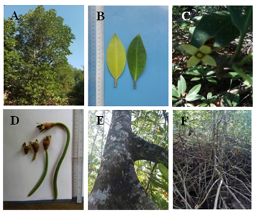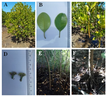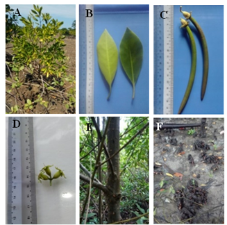 Figure 2 Rhizophora apiculata: (A) Habit. (B) Leaves. (C) Flower. (D) Fruits. (E) Stem and (F) Root.