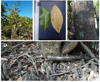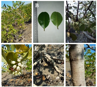 Figure 12 Avicennia marina (A) Habit. (B) Leaves. (C) Fruits. (D) Inflorescence. (E) Stem and (F) Root