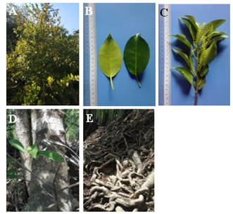 Figure 11 Avicennia officinalis (A) Habit. (B) Leaves. (C) Fruits. (D) Inflorescence. (E) Stem and (F) Root.