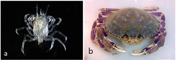 Family Varunidae: Hemigrapsus oregonensis (Yellow Shore Crab).16 Zoea and megalops identified by DNA barcode,503 and adult recognized by morphology (Figure 35).